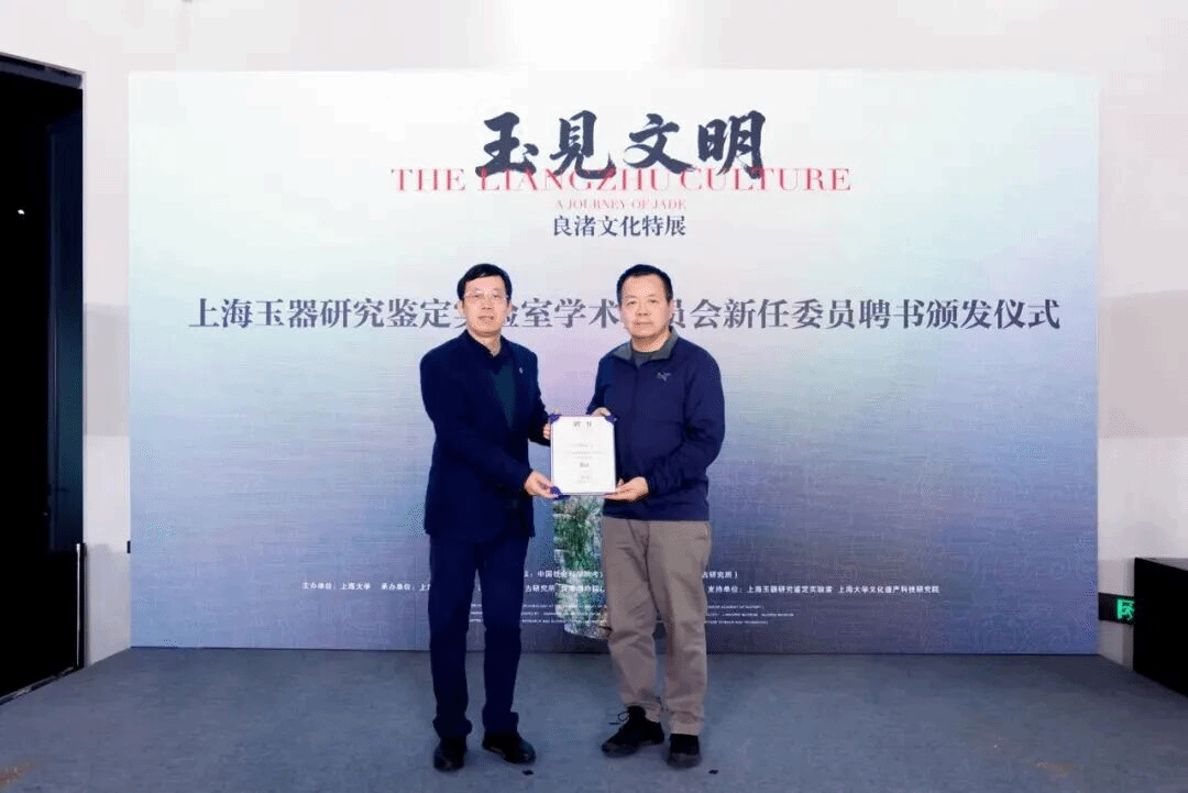 开幕式现场还同步举行了上海玉器研究鉴定实验室学术委员会新任委员聘任仪式与实验室副主任聘任仪式。中国科学院院士张统一受聘为上海玉器研究鉴定实验室共同主席,良渚博物院(良渚研究院)院长徐天进、浙江省文物考古研究所所长方向明、英属哥伦比亚大学人类学系教授荆志淳受聘为上海玉器研究鉴定实验室学术委员会委员,上海大学特聘教授马萧林受聘为上海玉器研究鉴定实验室副主任。