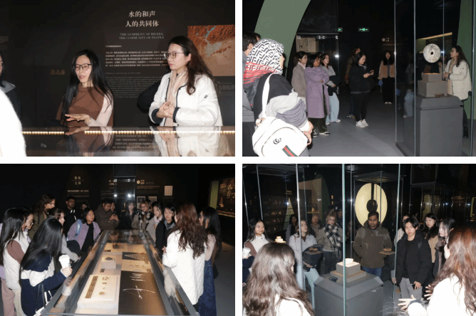 活动伊始,上海大学博物馆罗阳老师带领学生们走进良渚文化特展的奇妙世界。展厅内,精美的玉器、古朴的陶器静静陈列,承载着五千年良渚文明的密码。罗阳、Feifei两位老师以生动翔实的中英文讲解,将展品背后的历史故事、文化内涵娓娓道来,从玉琮的礼制象征到陶器的生活印记,从良渚先民的农耕智慧到早期国家的社会形态,让学生们直观感受到中华古代文明的厚重与璀璨。国际学生们不时驻足凝视、轻声交流,好奇地询问展品相关的细节,在互动中拉近了与良渚文化的联系。随后,Feifei老师带领师生开始了温暖治愈的颂钵体验。她引导大家调整呼吸、放松身心,开启与声音的深度连接。颂钵悠长醇厚的声波缓缓扩散,穿透耳膜、浸润身心,现场宁静祥和。大家闭上双眼,在声波的包裹中放下疲惫,体验着内心的安宁。