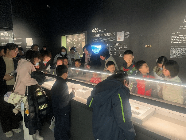共读环节结束后,老师带领孩子们走进“玉见文明:良渚文化特展”。此时的孩子们已不再是单纯的参观者,而是带着问题与知识的小小探索者。在玉琮、玉璧、玉钺前,他们能说出“这是和天地沟通的神器”;在石犁、破土器展柜旁,他们讨论“良渚人是不是左撇子”;在水利系统复原图前,他们惊叹“原来五千年前就有这么厉害的水坝”。从绘本到文物,从想象到真实,孩子们在展柜前完成了与五千年前文明的对话。
